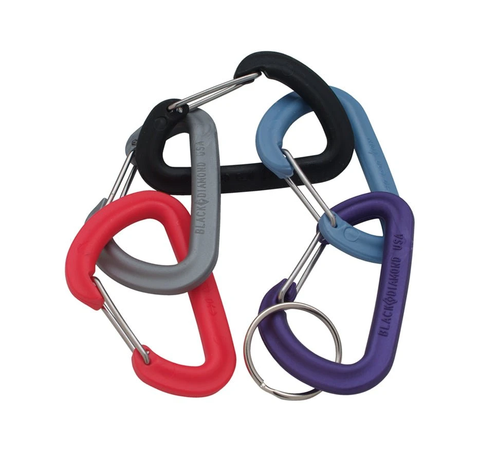 Brightly coloured plastic mini accessory carabiners are strong enough for keys or coffee mugs.