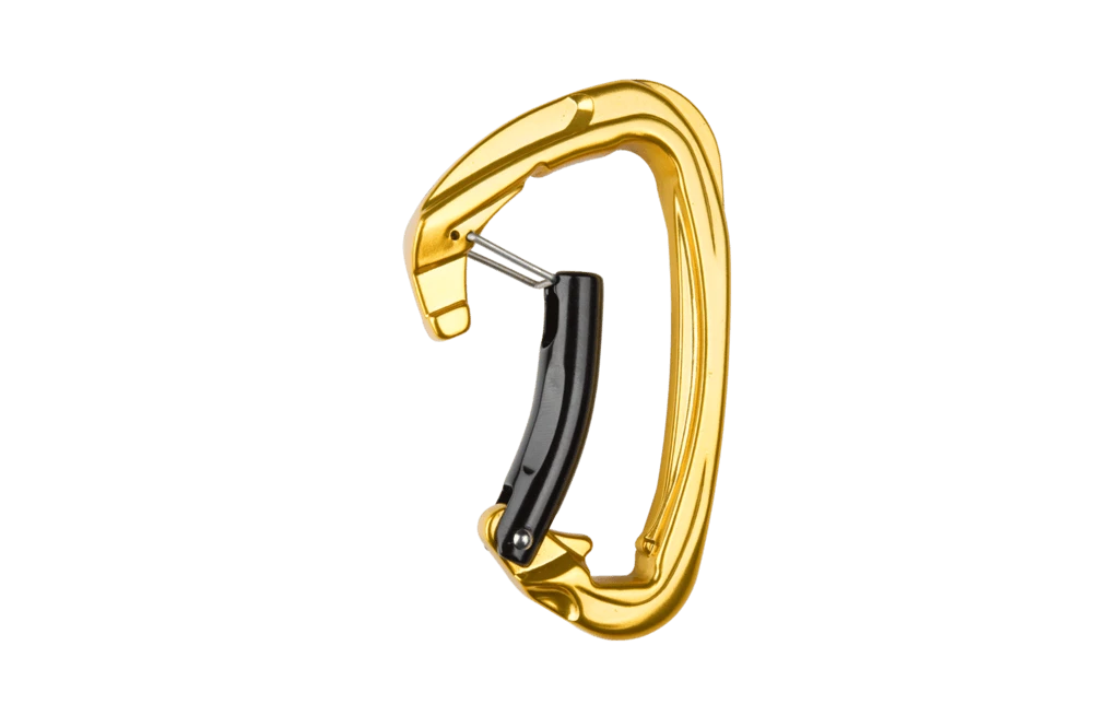 Classic carabiner made of aluminium, has an innovative system, a spring that keeps the gate open until it touches a rope, a bolt or an anchor, which pulls the spring and releases the gate which closes automatically.
