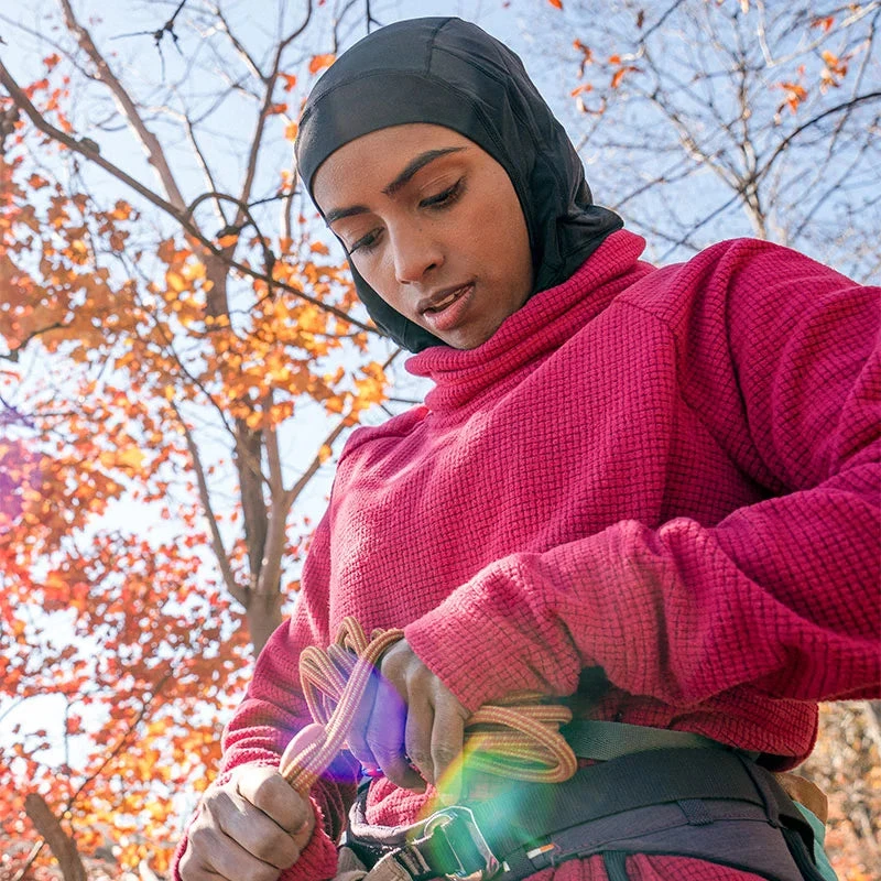The ActiveIce Hijab is a technical outdoor hijab that eliminates the need for pins for a secure fit, built with climbers, skiers, mountaineers, and hikers in mind.